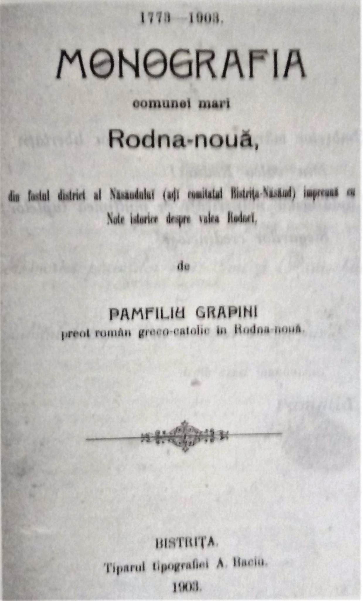 În anul 1903, apare la Bistrița, la Tipografia A. Baciu, prima monografie tipărită a comunei, monografie scrisă de preotul Pamfiliu Grapini și considerată, la acea vreme, una dintre cele mai bune lucrări monografice.