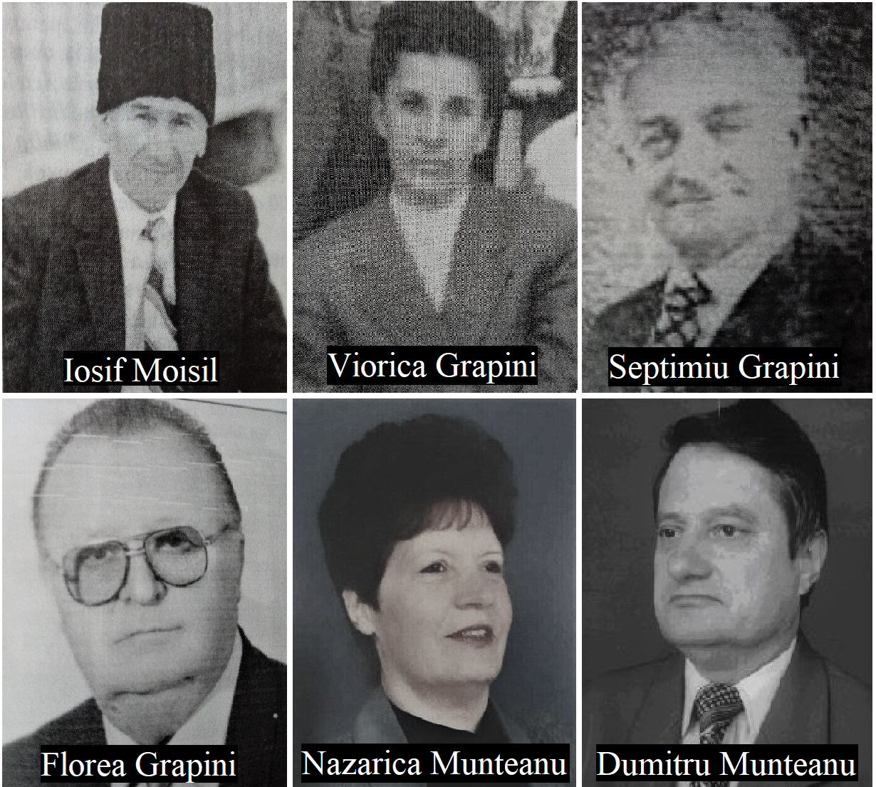 Iosif Moisil (1925 - 2009) , fiul lui Savir și Paraschiva, s-a născut în 21 iunie 1925, la Șanț, și a decedat la 22 martie 2009, în aceeași localitate. Începând cu anul 1965, s-a hotărât să adune documente, cărți și diferite obiecte ce puteau constitui un viitor muzeu sătesc. Fiind un apropiat al familiei preotului Pamfiliu Grapini, a organizat funeraliile fiicei acestuia, Reasilva, decedată în scurt timp de la revenirea ei în Șanț, în 1964, împreună cu fiica sa, Intuca, și cu ginerele său, căpitanul Filipoi Florea, de loc din Șanț. Ca recompensă, Intuca (doamna Intu, cum era cunoscută de săteni) și soțul ei i-au vândut lui Iosif Moisil toată biblioteca părintelui Pamfiliu, care cuprindea cărți valoroase precum: Istoria artelor, ilustrată, în limba germană, 10 volume, Enciclopedia României , 4 volume, Istoria Transilvaniei de 1000 de ani, Biblia în două volume, scrisă în limba germană și legată în aur. Ulterior, a primit cu titlu de donație documente și cărți valoroase de la academicianul Grigore C. Moisil, Onisim Filipoiu, Teodor Tanco, Teodor Ghițan ( Arhiva Someșană, 27 volume) și alții, ba chiar biblioteci personale întregi, de la George Olari și Dumitru Cotu. Mulțimea de cărți și obiecte a constituit „Muzeul sătesc”, recunoscut de specialiști și intrat în circuitul muzeal, dar netrecut în patrimoniul muzeistic național. În 30 iulie 1998, într-un incendiu de proporții, în care au ars șase gospodării, s-a mistuit și gospodăria lui Iosif Moisil și, implicit, și muzeul, munca lui de o viață dispărând pentru totdeauna. Dar nu s-a dat bătut, și-a reluat activitatea de colectare a cărților și obiectelor valoroase. Viorica Grapini (1925 - 2001) , fiica lui Vasile și Emilia, s-a născut în 7 august 1925, la Sânpetru de Câmpie, județul Mureș. A absolvit Institutul Pedagogic de 3 ani și Facultatea de Istorie și Geografie din București (1970). Căsătorită cu Septimiu Grapini, în 28 aprilie 1952, și-a urmat soțul în localitățile unde acesta a ocupat diferite funcții, ea lucrând în domeniul funcționăresc (spre exemplu, șefa Serviciului buget la Sfatul Raional Năsăud, 1950 – 1952). Profesoară de geografie și de franceză la Școala generală din Șanț (până la 1 septembrie 1981, când s-a pensionat), s-a dovedit extrem de credincioasă profesiei și generațiilor de elevi. A înființat un punct meteorologic în curtea casei sale și unul în grădina școlii. Ani la rând, cu ajutorul elevilor, a adunat date meteorologice pe care le-a fructificat în Scurta monografie a Comunei Șanț (1773 – 1986) , monografie scrisă împreună cu soțul ei Septimiu Grapini, alcătuind și alte capitole esențiale, ce țin de poziția geografică, relieful, solurile, rețeaua hidrografică, vegetația și animalele, resursele minerale etc. ale Șanțului. A scris Însemnări din viața comunei Șanț. 1900 – 1989, lucrare păstrată în manuscris de urmași, în care a consemnat cele mai semnificative fapte și evenimente de pe plan local și național. S-a stins din viață la Șanț, în 1 ianuarie 2001. A rămas în memoria șănțenilor și a generațiilor de elevi ca o foarte bună dăscăliță, o doamnă distinsă și modestă, cultă și mărinimoasă, care impunea respect. Sabin Sas (1932 – 2020) s-a născut la Șanț, în 11 octombrie 1932, și a decedat în 14 mai 2020, la București. A absolvit: Școala generală (șapte clase) la Șanț, Liceul „George Coșbuc” din Năsăud, Facultatea de chimie a Universității „Babeș-Bolyai” din Cluj-Napoca, aici luându-și și doctoratul. A lucrat ca inginer-șef și director la fabricile „Potaissa”, „Turdeana” și Fabrica de Ciment Turda (1955-1960), expert în Comisia Economică (1960-1965), director general în Comitetul de Stat al Planificării, București (1965-1989), după 1989, în Ministerul Economiei Naționale (1990-1991). A fost responsabil de documentația tehnică a întreprinderilor înființate de stat în zonele Bistrița, Zalău și Cluj. A făcut parte din ASTRA năsăudeană începând cu anul 2012. În 2011, i s-a conferit titlul de Cetățean de onoare al orașului Năsăud. Florea Grapini (1938 - 2019) s-a născut în 9 ianuarie 1938, la Șanț. A studiat la școala din Șanț, Școala Profesională Minieră din Ghelari (județul Hunedoara), Școala Medie Tehnică de Minereuri de la Brad (Hunedoara) și Școala Tehnică de Maiștri din aceeași localitate. A susținut examenul de diferență și bacalaureatul la Liceul de Matematică și Fizică. S-a căsătorit cu Domnica Ruxandari, cu care a avut două fete. A profesat ca tehnician maistru și ca inspector tehnic de protecția muncii la Inspecția Tehnică pentru Protecția Muncii a Regiunii Suceava. În perioada 1969 – 1974, a urmat cursurile Facultății de drept a Universității „Babeș-Bolyai”, din Cluj-Napoca. A fost preocupat de viața și activitatea unionistului șănțean Enea Grapini și ale tatălui acestuia, părintele Pamfiliu Grapini. După ani de cercetări, a scris și publicat trei cărți: Enea Grapini și Ziua cea Mare, Editura Fundația „Constantin Titel-Petrescu”, București, 1999, Ediția a II-a revăzută și adăugită, Editura Lidana, Suceava, 2018, Cartea vieții Părintelui Grapini, Editura Mușatinii, Suceava, 2003 și Scurtă cronologie a social-democrației române, Editura Lidana, 2005. În cadrul sărbătorii „Fii satului”, din 29 și 30 iunie 2006, când s-a dezvelit și bustul lui Enea Grapini din fața școlii din localitatea Șanț, omului de cultură Florea Grapini i s-a acordat titlul de Cetățean de onoare al comunei Șanț. S-a stins din viață la începutul lunii septembrie 2019. Dumitru Munteanu (1948 - 2021) , fiul lui Gheorghe și Laura, s-a născut în Telciu (Bistrița-Năsăud), la 25 octombrie 1948, și a decedat în 30 decembrie 2021, la Bistrița. Studii: Liceul „George 